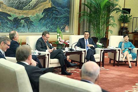 6月9日,国务院总理李克强在北京人民大会堂会见来华出席全球首席执行官委员会第三届圆桌峰会的代表,并同他们座谈交流。新华社记者姚大伟摄